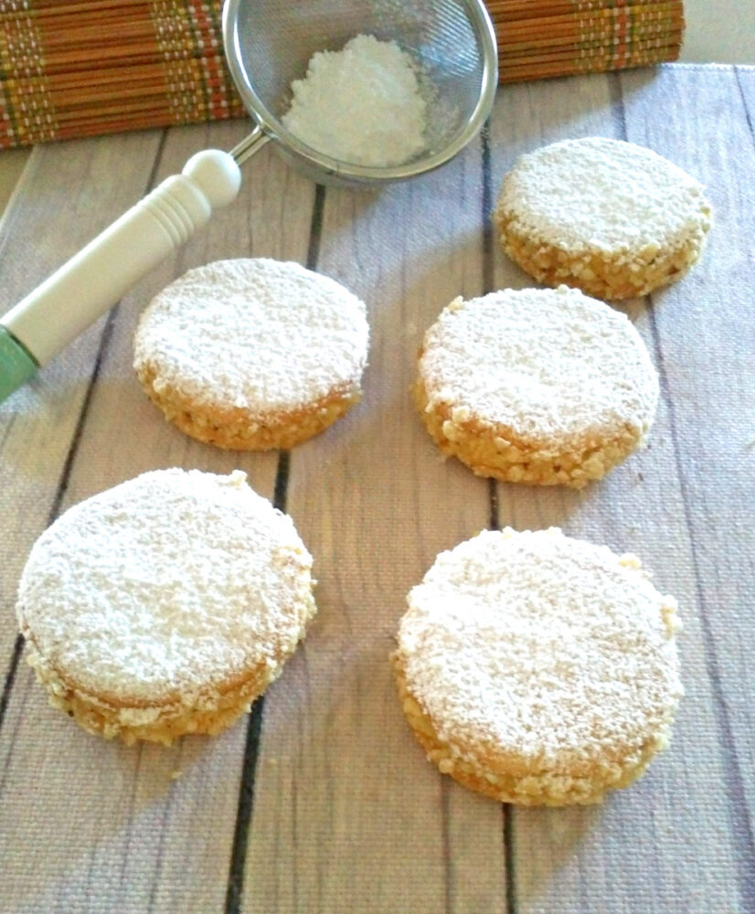 Stendere la pasta frolla piuttosto spessa, tagliare con un coppa pasta 24 dischi. posizionarli sulla placca del forno ed infornare a 180 gradi, forno statico, per 20 minuti (devono rimanere piuttosto morbidi).
