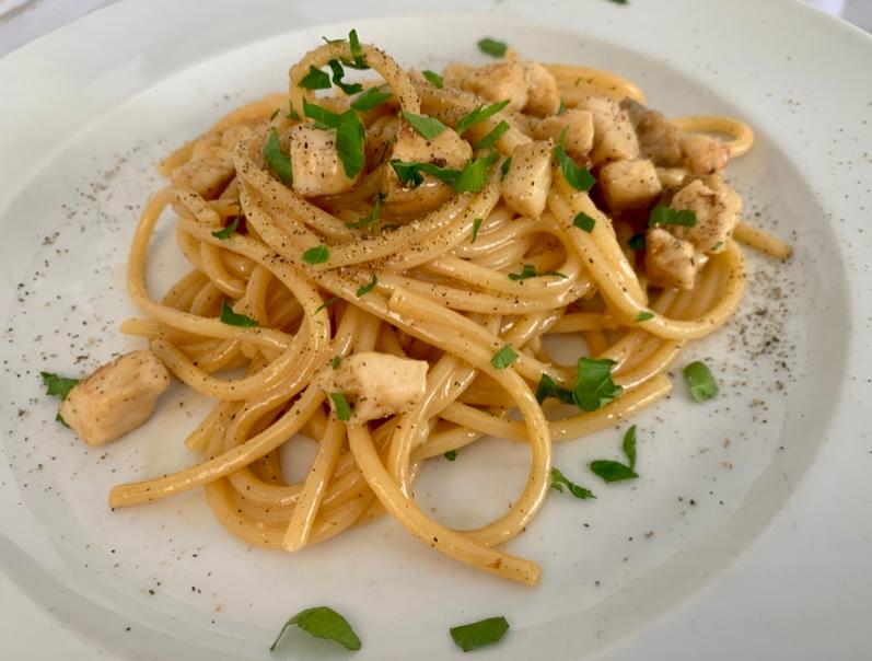 La pepata di cozze, le polpette di pesce, la frittura di mare ma soprattutto gli Spaghetti Boccaccio, il “piatto carta d’identità”, un trito di frutti di mare in salsa di pomodoro leggermente piccante che condisce gli spaghetti perfettamente al dente (forse cambierei il formato dello spaghetto, troppo sottile, ma riconosco che non sarebbe più lui). Io invece ho goduto di un crudo di mare del quale ancora sogno il tonno e i gamberi, avrò pure beccato il giorno migliore in assoluto ma erano davvero tra i migliori mai assaggiati, ed i miei soliti involtini misti di calamari e spatola (pesce sciabola, da assaggiare assolutamente se non lo si conosce) o di pescespada quando c’è.