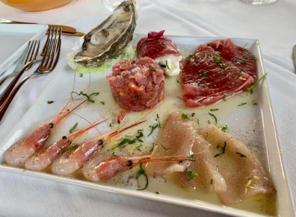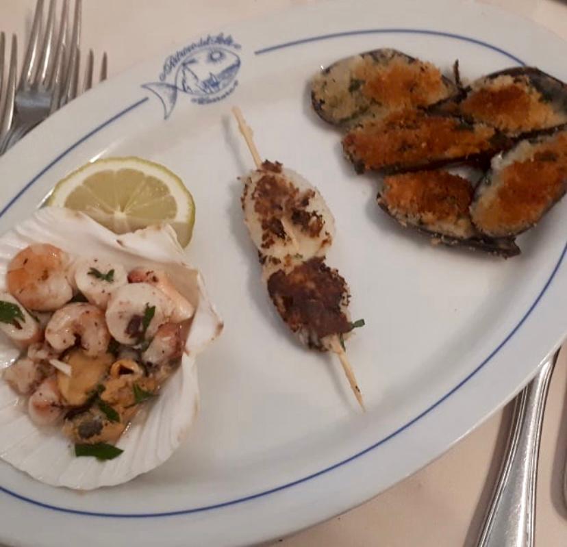 La carrellata di antipasti è d’obbligo, un piattino dietro l’altro uno migliore dell’altro. Sono sempre più o meno gli stessi a seconda del pesce che c’è ma vi assicuro che non stancano mai.