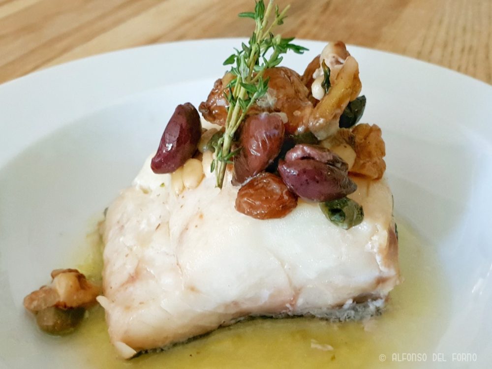 Questo piatto rappresenta l’identità stessa dei sommesi, divisa tra il commercio della frutta secca e quello del baccalà. Noci, uvetta e pinoli, con capperi e olive, sono cotti sottovuoto a bassa temperatura insieme al baccalà. Tutto si amalgama e si fonde, con il pezzo di baccalà poggiato su un sughetto di mela verde, guarnito con gli ingredienti usati in cottura. Trovo molto interessante l’abbinamento di questo piatto con una Tripel, con note fruttate, una tendenza dolce iniziale e il finale secco con un accenno di amaro.