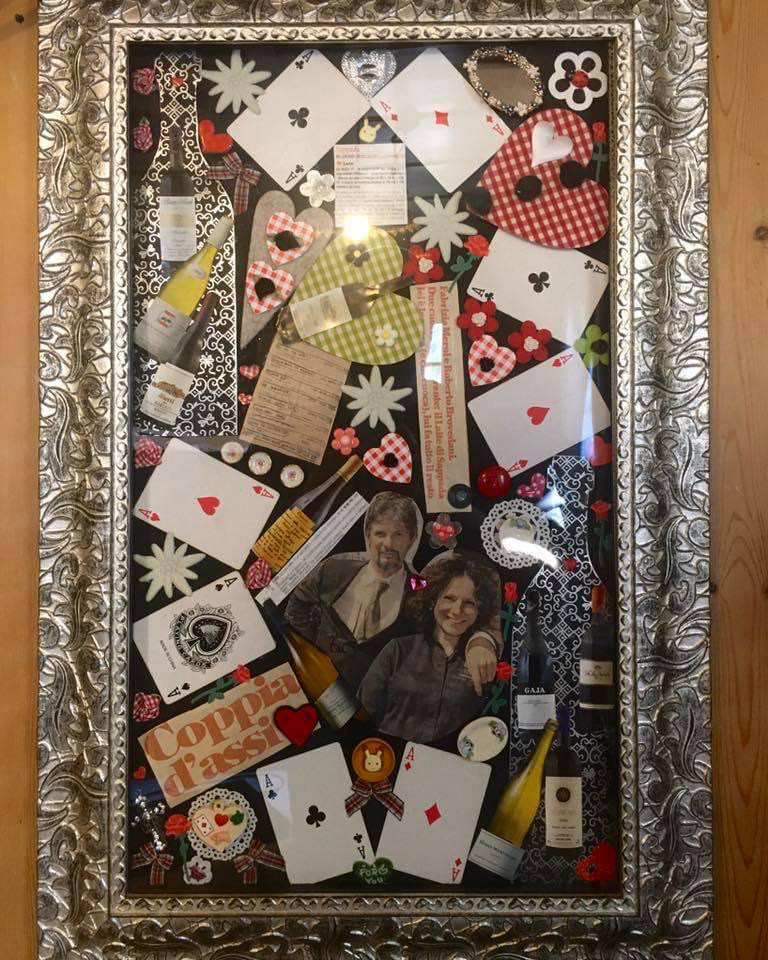Sulla parete di fronte al tavolo un curioso mosaico, che incornicia un ritaglio di abbraccio tra Roberto e Fabrizia, attirerà la mia attenzione per tutto il tempo, fin quando non apparirà in sala Fabrizia in persona.