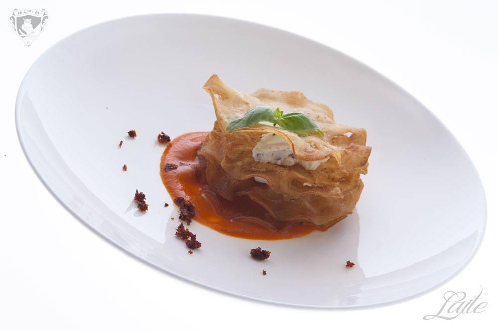 Millefoglie di melanzane, saurnschotte, pomodoro – ph.Ristorante Laite