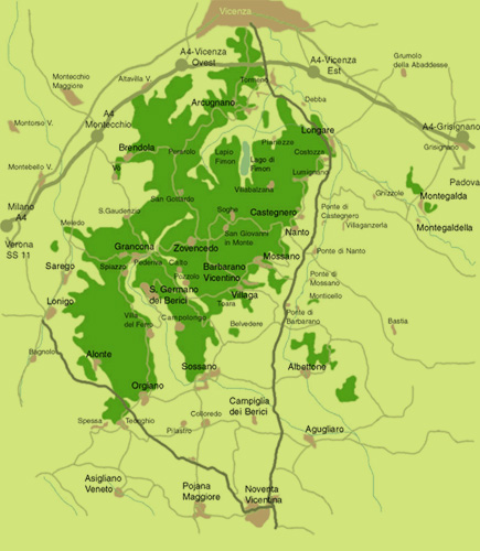 Dal punto di vista geografico i Colli Berici, posizionati centralmente rispetto ai più famosi Colli Euganei e ai Monti della Lessini, rappresentano una formazione collinare di altezze modeste (300-400 metri s.l.m.), localizzata nella zona più a sud di Vicenza, i cui rilievi si sono formati circa sessanta milioni di anni fa da corrugamenti e sollevamenti tettonici. La natura dei suoli si combina in una trama di caratteri, ideali per dar vita a vini strutturati e eleganti. La roccia calcarea, i terreni ad argille rosse ricchi di scheletro, quelli basaltici di origine vulcanica, l’altitudine che preserva da nebbie e gelate tardive, le ridotte precipitazioni: l’insieme di queste condizioni favorisce la coltivazione di un’ampia varietà di vitigni, la crescita di uve assolutamente sane e la produzione di vini di forte personalità.