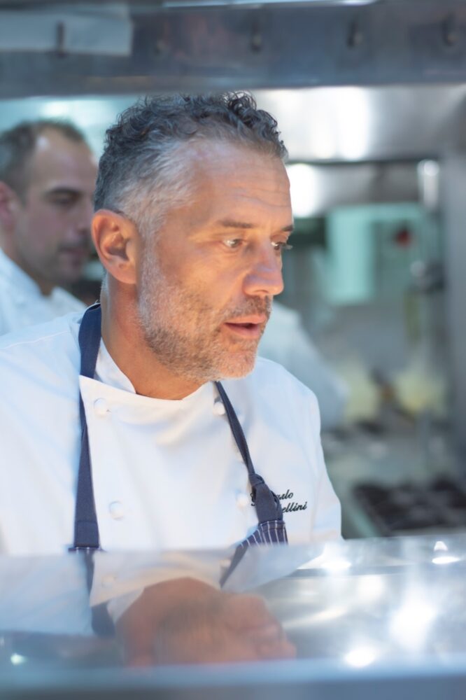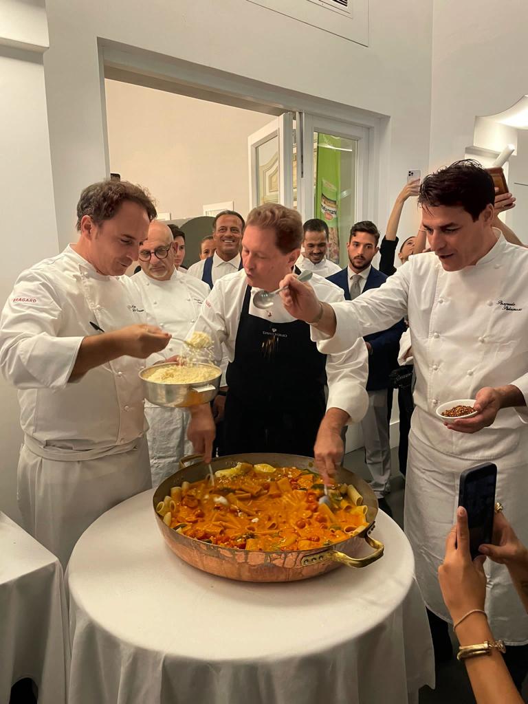 Nino Di Costanzo e Pasquale palamaro alle prese con i paccheri di Chicco Cerea