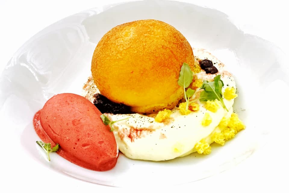 Aperitivo all’italiana: sfera di aperol spritz, ricotta e arachidi