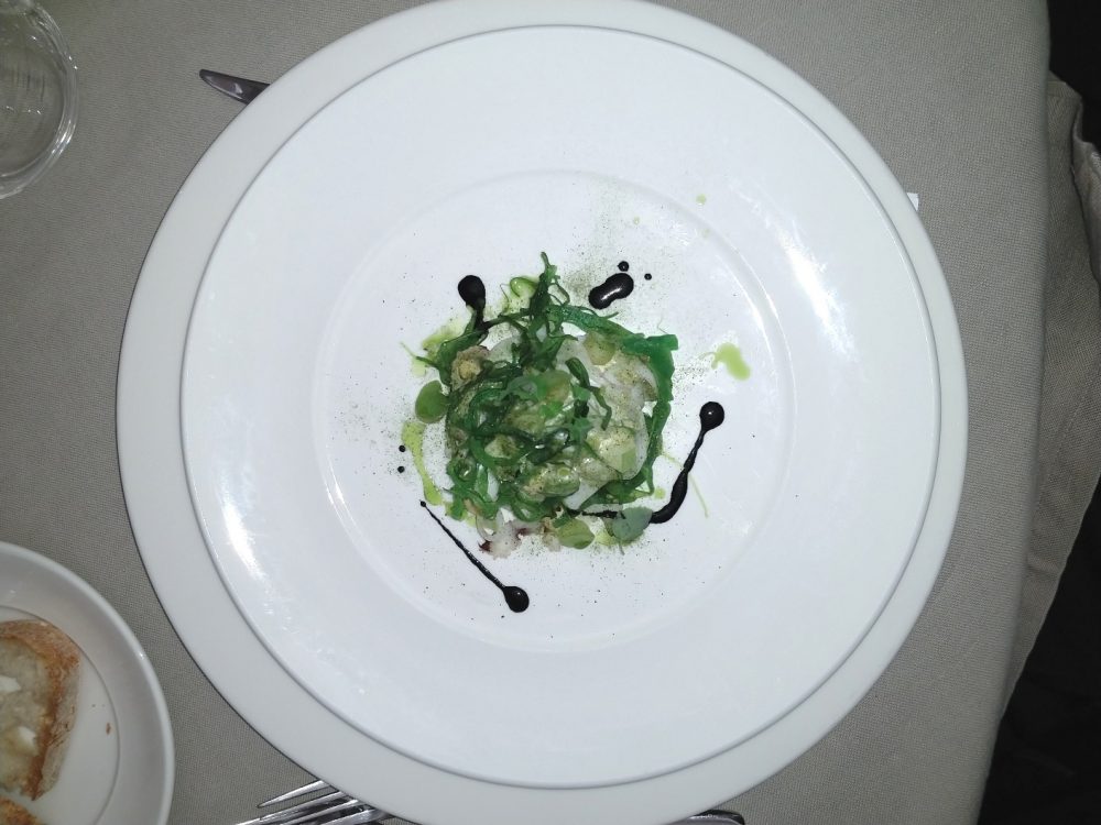 Veli di seppia in court-bouillon aromatico, mela verde, wakame e soia;