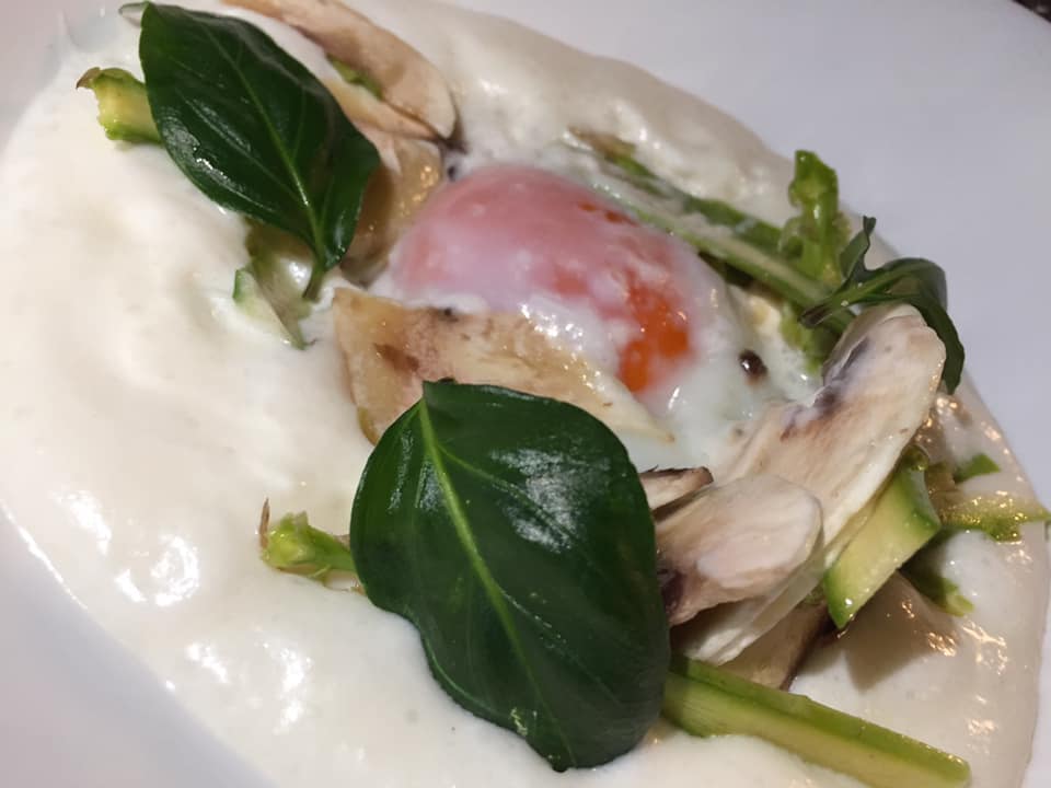 Jacopa, uovo, spuma di parmigiano, asparagi e funghi