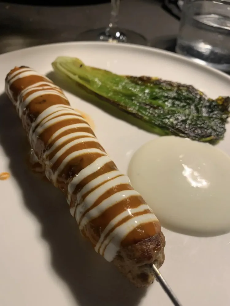 La zucca hokkaido cotta al forno è in buon equilibrio con la crema di bufala affumicata, mentre lo spiedo di agnello con yogurt e lattuga arrosto ricorda piacevolmente un kebab.