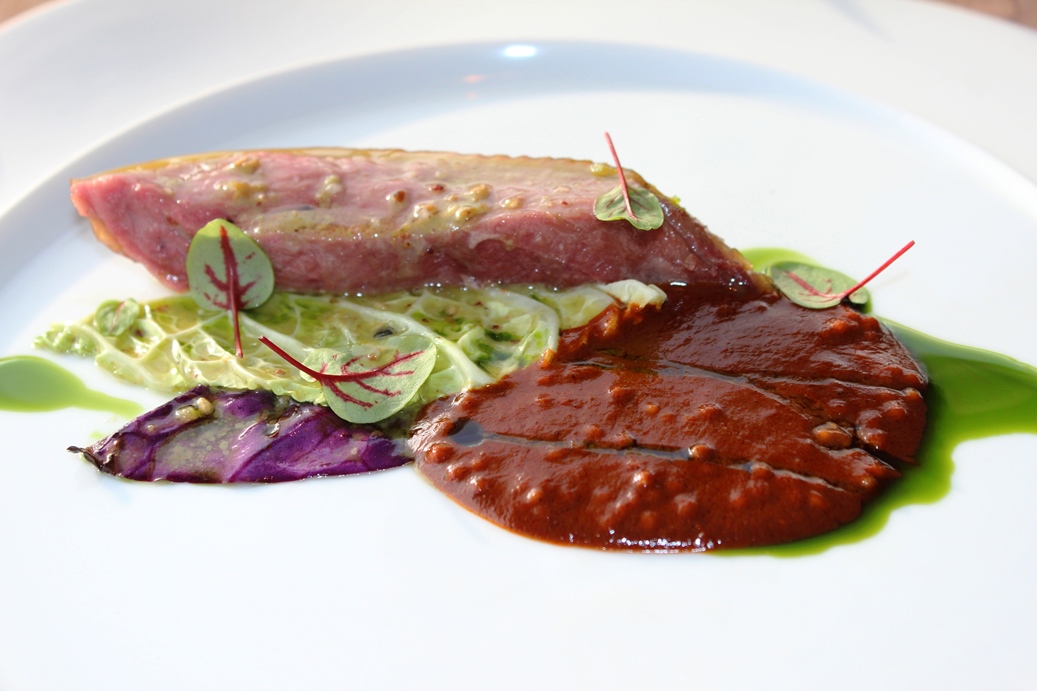 Arrivano i piatti principali, il rombo, pepe di chihuacle, salsa di aglio nero e agrumi, purè di topinambur, l’animella di vitello, gel d’ibisco, cipolla bruciata e tartufo bianco e l’anatra, mole della città d’Actopan, semi di senape e cavolo brasato. Tutti i cuochi a tutti a tutte le latitudini e le longitudini, si giudicano per il “dominio del fuoco”, per le cotture, tutte millimetriche, in questo caso, a dimostrazione di una grande sensibilità nell’abbinamento e rispetto verso la materia prima.