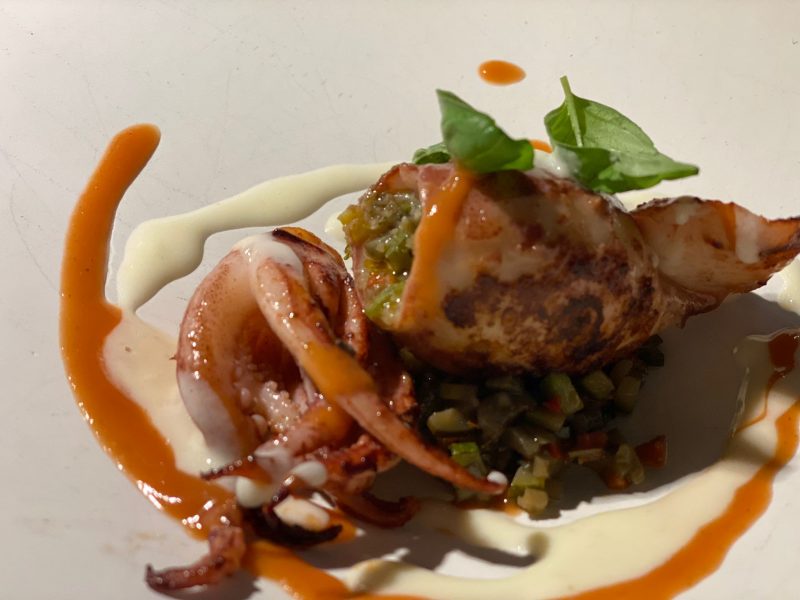 Il punto più alto del gioco tra l’orto ed il mare è di sicuro Il Totanetto ripieno con ciambotta e ristretto di pomodoro, inumidita dalla fonduta di provola: combinazione perfetta, così come la cottura veloce , che lascia il croccante al morso.