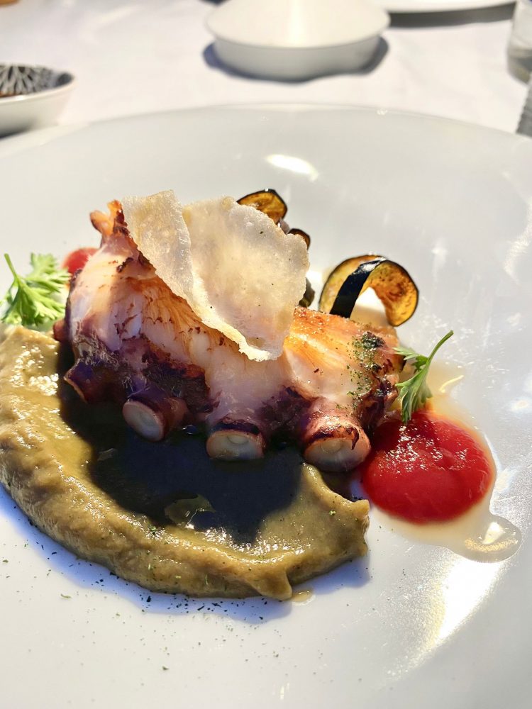 La Crestarella – Polpo scottato, salsa di melanzana affumicata, ketchup di San Marzano, sciroppo di melanzane affumicate