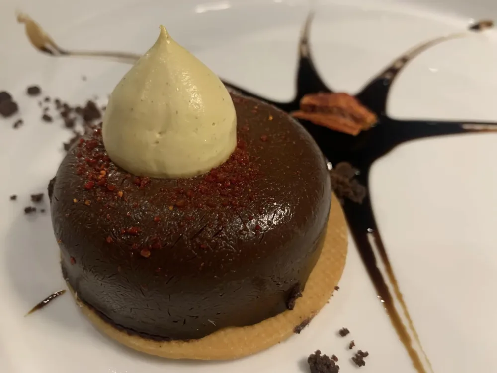 Guancia di maialino iberico con latte di cocco, cacao amaro e marmellata di arance agrodolce. Prezzo 18,00 euro.