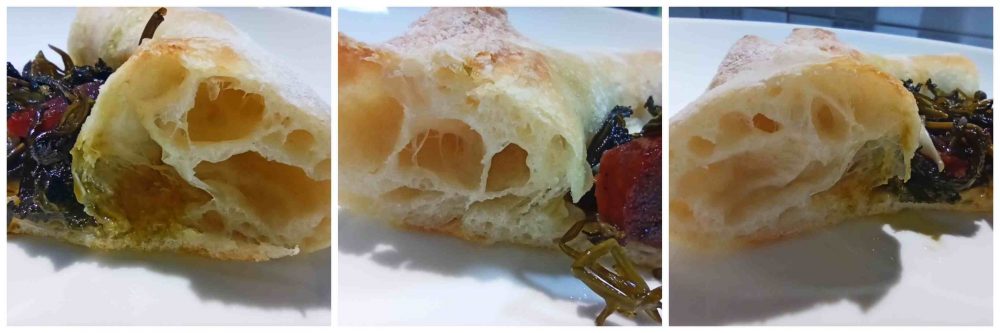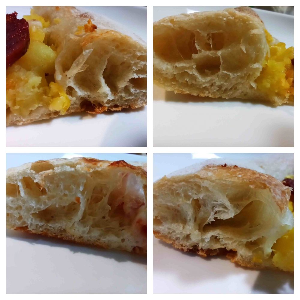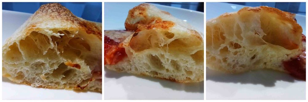 Non nascondo che, quando la temperatura ambiente di qualche stanza si può tenere intorno ai 18 gradi, mi diverto molto con gli impasti per fare la pizza in casa con lievitazioni di circa 48 ore senza l’ausilio del frigo. Mi diverto e trovo soddisfazione nel guardare l’impasto gonfiarsi e disegnare tanti multiformi cunicoli nonostante la temperatura di cottura del forno elettrico di casa utilizzato non possa andare oltre i 230 gradi.