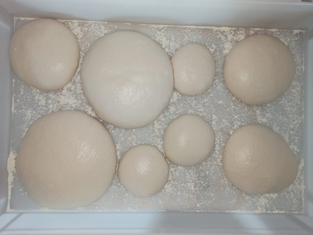 Ricetta per 4 panetti di circa 600 grammi (ogni panetto va bene per una teglia da forno da cucina) oppure 8 panetti da 300 grammi (per pizza tonda).