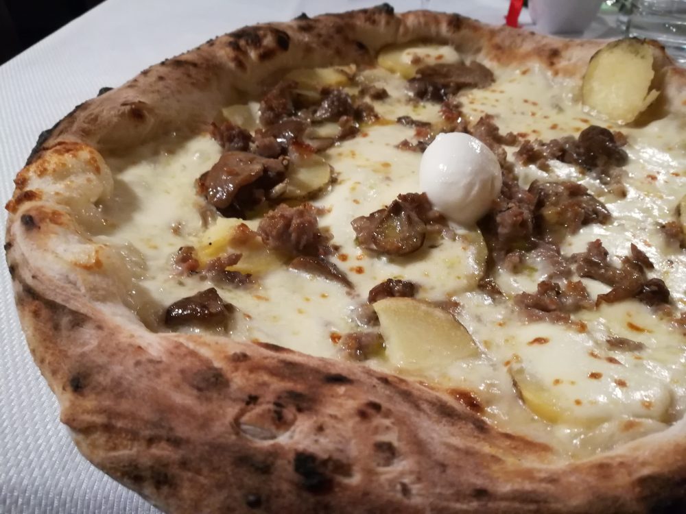 Dal menù della Pizzeria, che è stato arricchito ed aggiornato da poco, scegliamo due proposte i cui nomi richiamano subito alla mente la territorialità di alcuni ingredienti di condimento. Assaggiamo dunque La Cusanese con Funghi Porcini di Cusano Mutri, Salsiccia al finocchietto e Patate lesse tagliate con tutta la buccia; e La Giallo Locanda con Datterini Gialli, Guanciale di Maialino Nero Casertano e scaglie di uno stratosferico pecorino stagionato. Completa il tutto l’ottimo olio extra vergine di olive sannite.