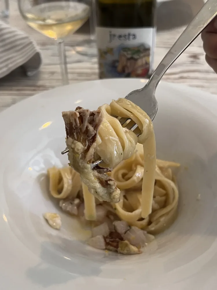 La fettuccia di Gragnano con ombrina cotta e cruda e la sua bottarga unita ai carciofi dà sicurezza, un piatto godibile, perfetto ed equilibrato nella sua complicata semplicità.