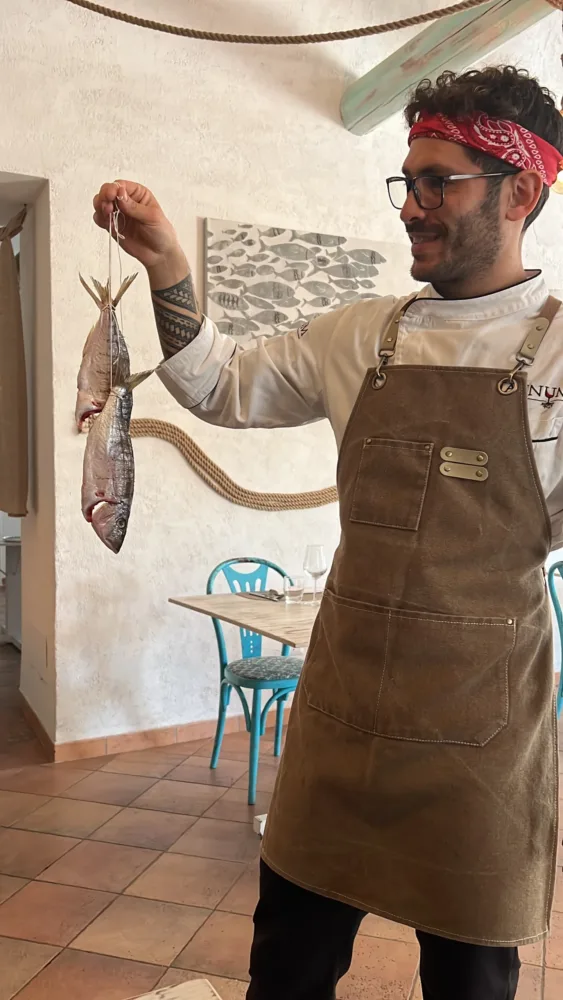 Questo giovane chef è flegreo (ardente) anche nelle mani. Raccoglie con cura le verdure e gli ortaggi nell’orto della stessa azienda, fa anche un pane buonissimo e si dedica alla frollatura del pesce.