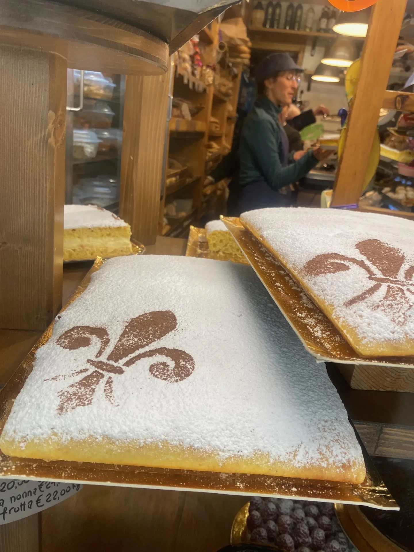 Sfornare e, una volta fredda, decorare con un abbondante strato di zucchero a velo e, con l’aiuto di uno stencil, riprodurre con la polvere di cacao il tradizionale giglio fiorentino.