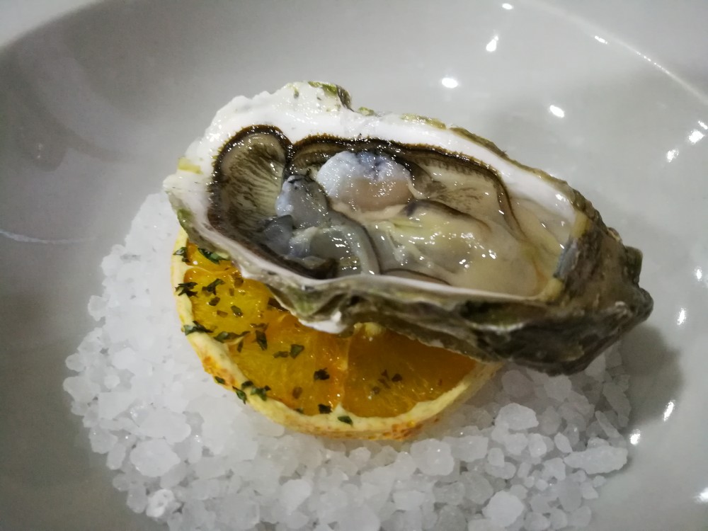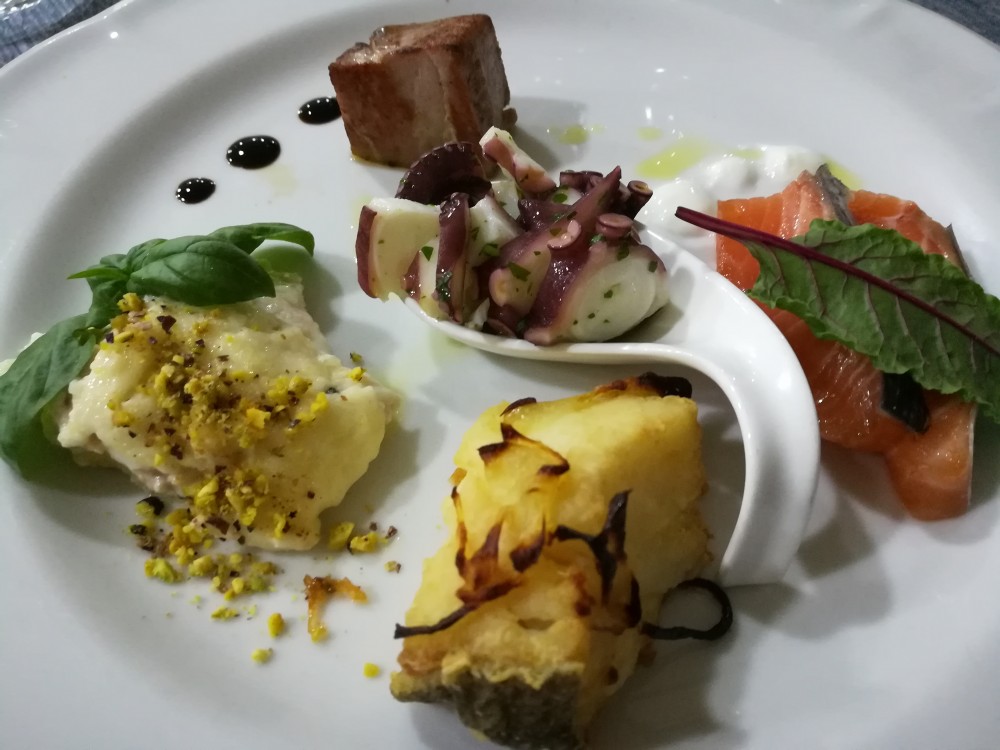 Si comincia dunque per me con un intrigante e ben presentato entrée di crudi di mare (composto da Gamberi bianchi con zeste di limone, Gamberi rossi con olive caiazzane, Sashimi di Tonno e Ostriche) e antipasto “caldo” di mare (composto da Filetto di Tonno grigliato, Filetto di Baccalà con Cipolle di Alife, Parmigiana di Pesce Spada con besciamella di latte nobile locale e granella di Pistacchi, Insalata di Polipo, e Salmone presalè ovvero marinato a secco con sale, zucchero ed erbe aromatiche).