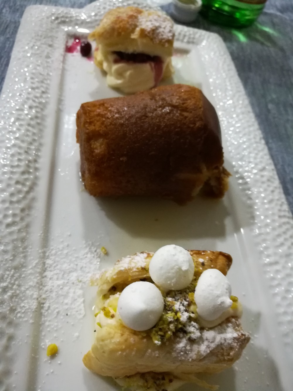 Scopriamo che il lardo che avvolge i gamberi proviene da un piccolo allevatore/agricoltore della zona che produce piccole quantità di grande qualità di prodotti tra cui anche della Mozzarella di Capra e delle piccole amarene sciroppate che troviamo nella Millefoglie artigianale servita alla fine vicino al Babà e alla Millefoglie al Pistacchio.