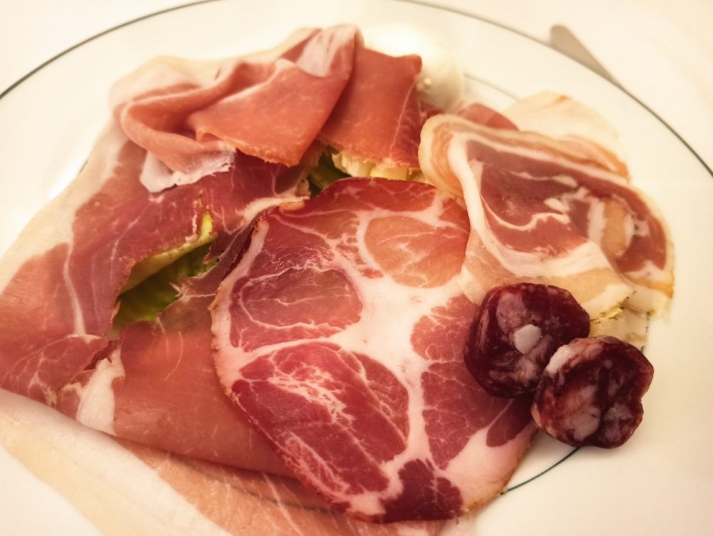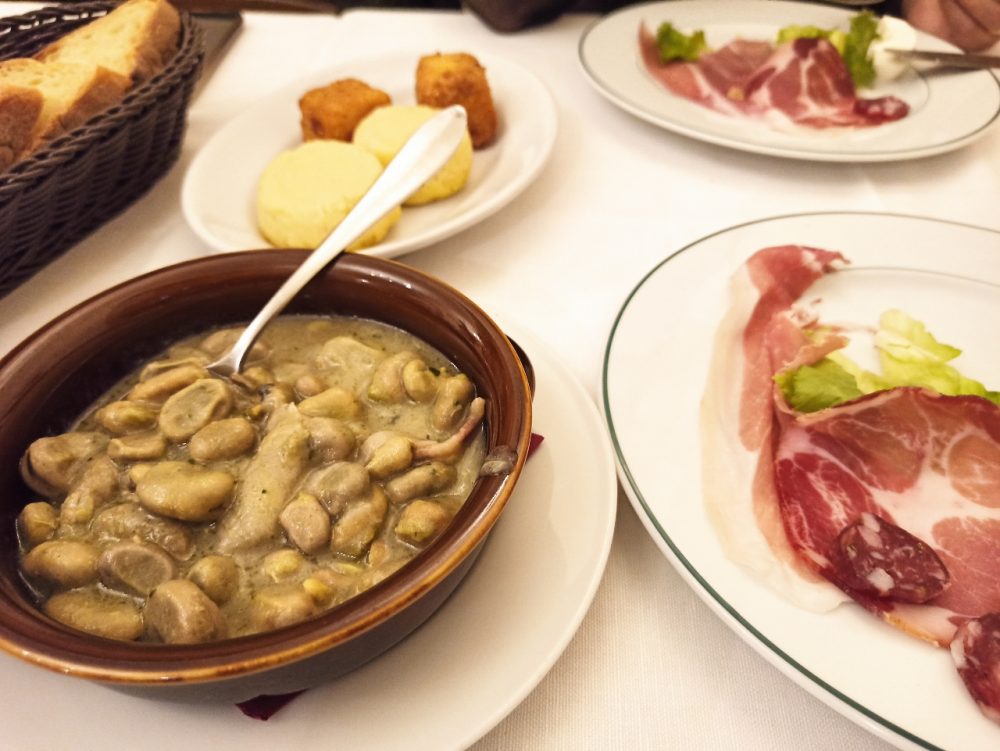 -un Antipasto con una selezione di Salumi Irpini, una eccezionale zuppetta di Fave con pancetta e menta, uno sformatino di patate e porcini (che probabilmente avrebbe reso ancor di più nella “vecchia versione cremosa” gratinata nel tegamino che ci hanno raccontato) e il delizioso Tocchetto al Carmasciano, un pecorino tipico dall’inebriante sapore e profumo che caratterizza questa sorta di crocchè cubico;