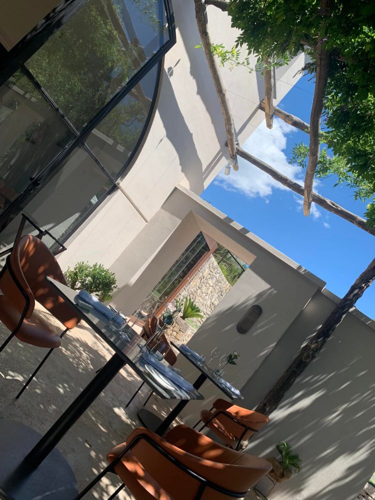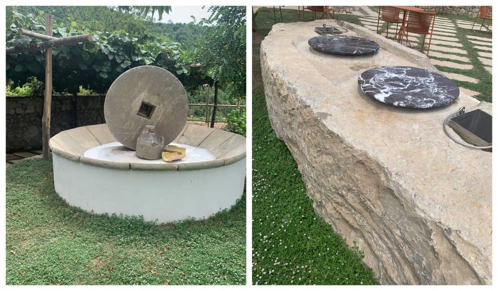 Laqua di Antonino Cannavacciuolo,il vecchio torchio nel giardino, una parte usato come bancone per aperitivi