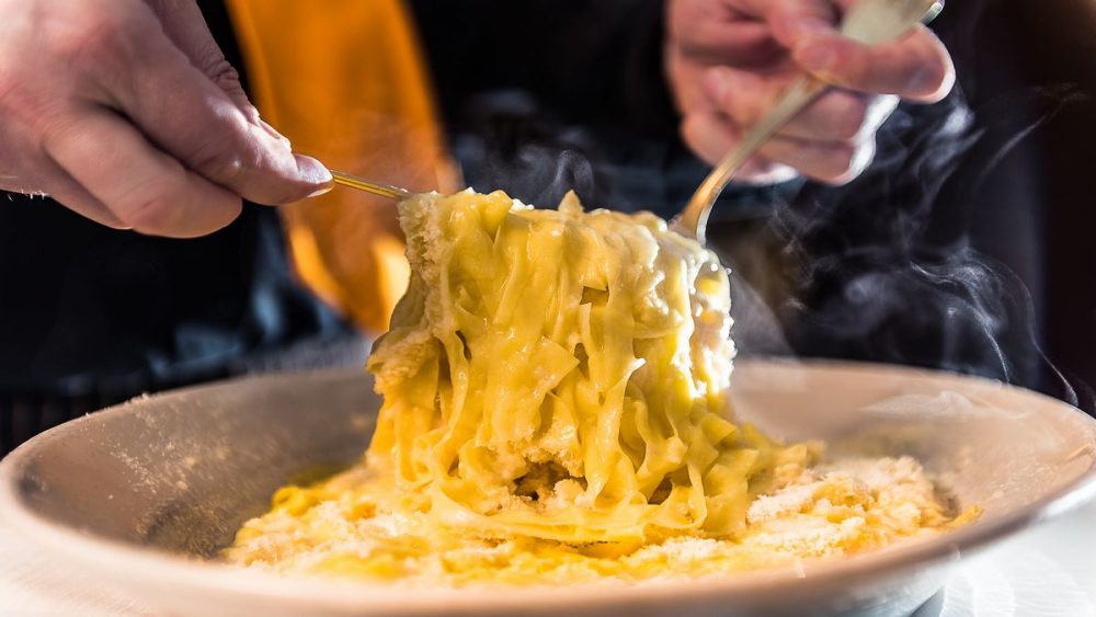 “Quando qualcuno, nel ristorante di via della Scrofa, ordina un piatto di fettuccine Alfredo – spiega Mozzetti – lo chef ha bisogno solo di fettuccine all’uovo preparate in casa, parmigiano reggiano freschissimo e morbido burro di prima qualità. Burro e parmigiano vengono adagiati nell’originale piatto Alfredo, dove vengono poste le fettuccine precedentemente scottate in acqua bollente per pochi istanti.