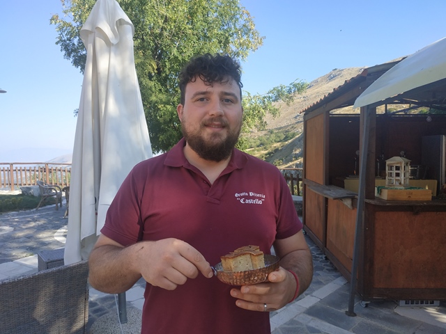 Si prosegue con i muffin e la famosa torta roce, ricoperta da uno strato di glassa di zucchero, il naspro e composta da un semplice pandispagna realizzato con farina bianca e farina di semola, con una bagna alcolica alla frutta composta da un mix di liquori e una farcitura con crema pasticcera e crema al cioccolato. E così, a oltre 1000 metri di altitudine, piatto dopo piatto e pizza dopo pizza, la famiglia Rumolo racconta la sua storia e quella del piccolo borgo di Caggiano.