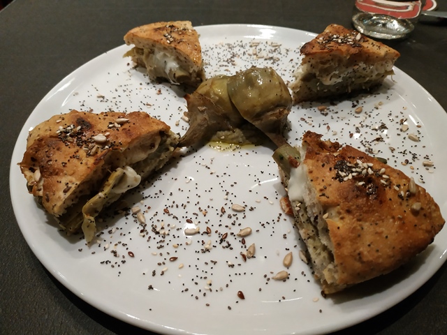Antifocaccia con semi misti, carciofo alla romana, Steccata di Morolo e crema di carciofo