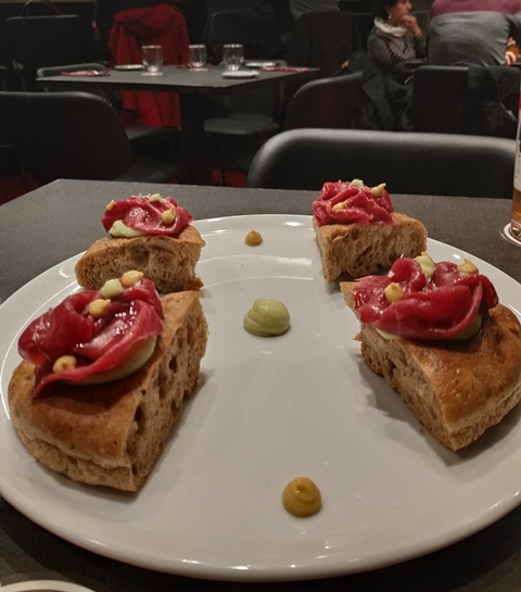 Antifocaccia spontanea con carpaccio di manzo di maremmana e senape di Digione