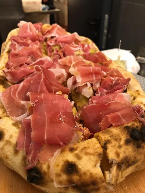 La pizza tonda con ricotta di bufala, prosciutto di Parma 24 msi e ricotta salata