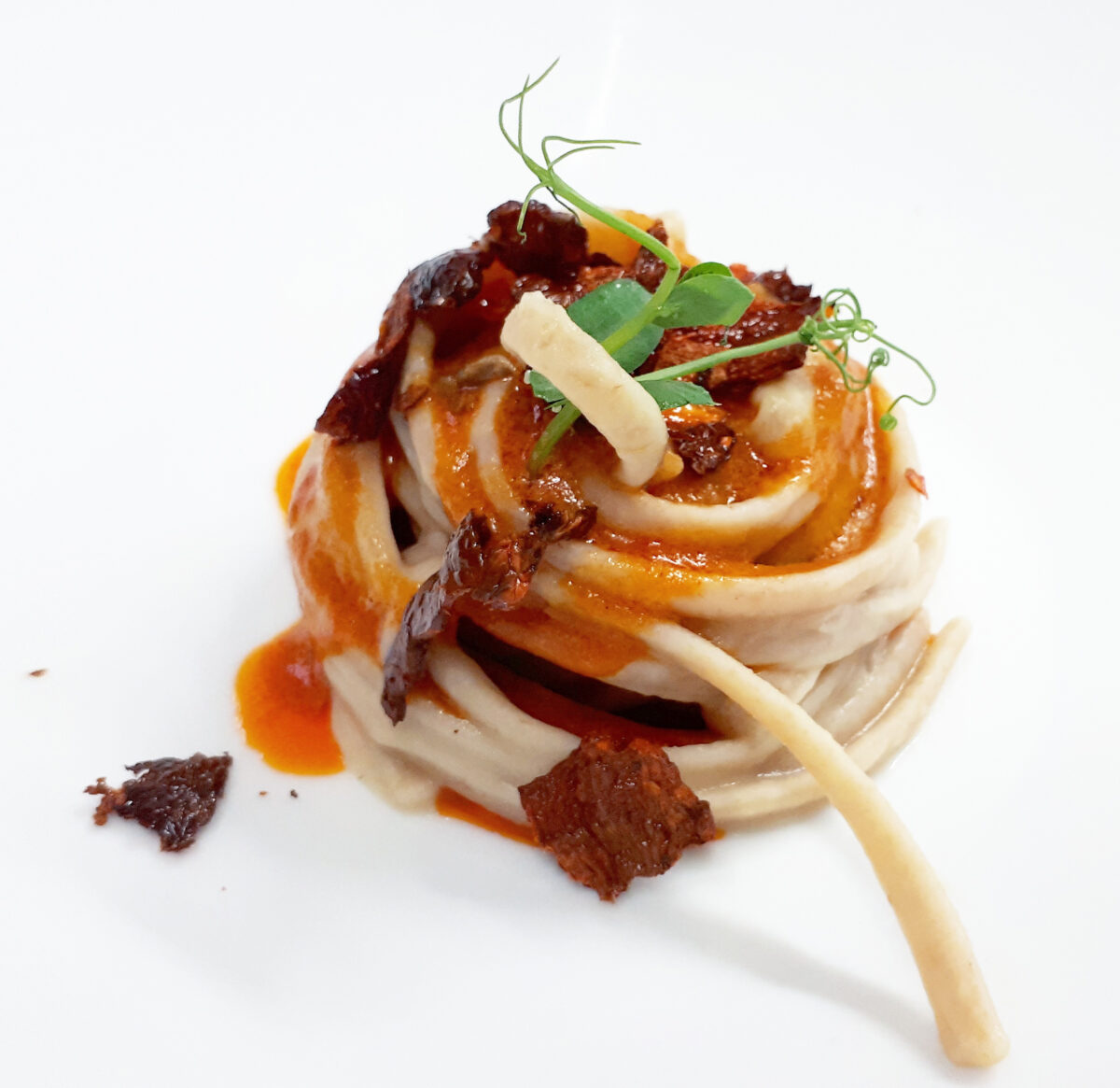 Impiattare il nido di stroncatura condendolo con la salsa alla 'nduja e dei peperoni cruschi sbriciolati grossolanamente.
