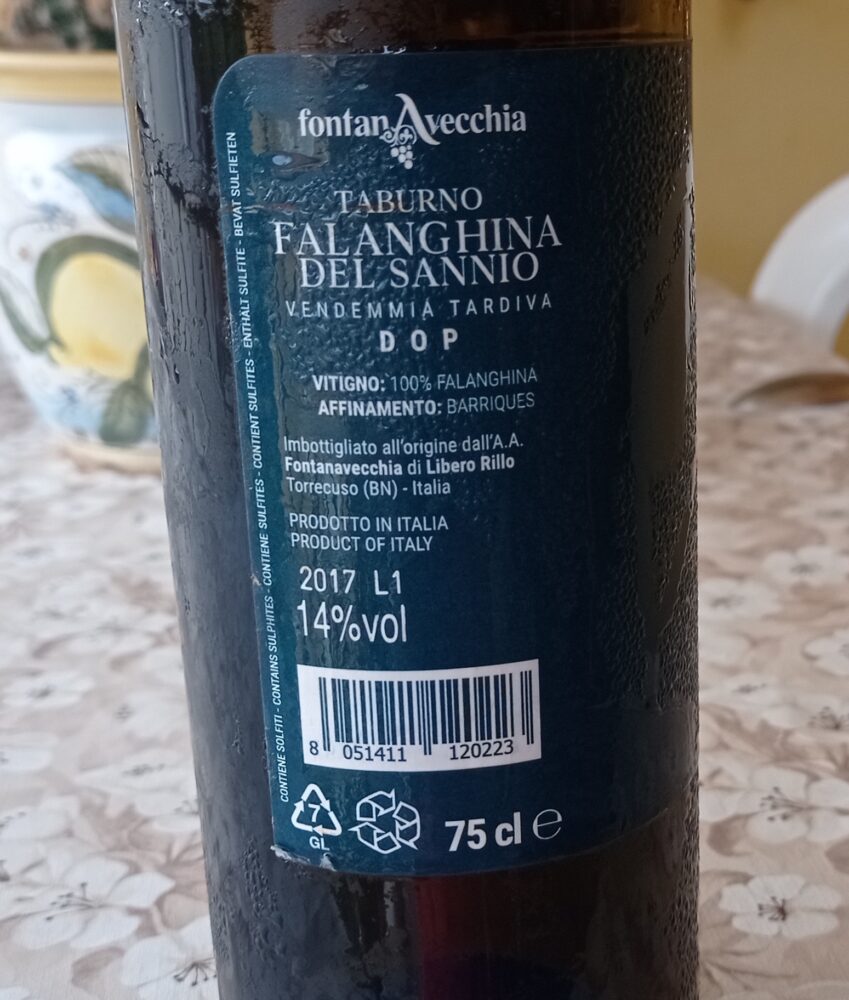 Taburno Falanghina del Sannio Vendemmia Tardiva Dop 2017. Soltanto Falanghina vendemmiata ad inizio di ottobre. Maturazione per l’80% in acciaio ed il restante 20% in barriques. Tasso alcolico di quattordici gradi. Prezzo finale di 22,00 euro. Riassaggio questo millesimo giusto a distanza di due anni per valutarne la tenuta e se nel frattempo è cambiato qualcosa.
