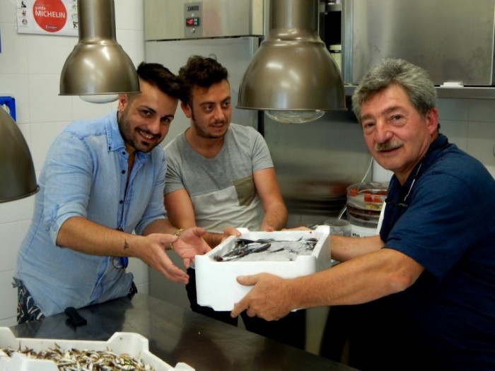 Stavano eviscerando una spasella assortita di pezzogne, spigole, orate e ricciole. Tutto fresco fresco che più fresco non si può!!! Ho incrociato lo sguardo sornione di Mirko, lo chef-folletto, e in quel momento potevamo anche non parlare…già c’eravamo detti tutto. Ho notato quindi che incominciava a selezionare le interiora e a metterne da parte alcune (bottarga, latterini, fegati e altro). E cosa ne è uscito fuori? Una meravigliosa linguina al ragù di quinto quarto ittico. Ecco la ricetta!!!