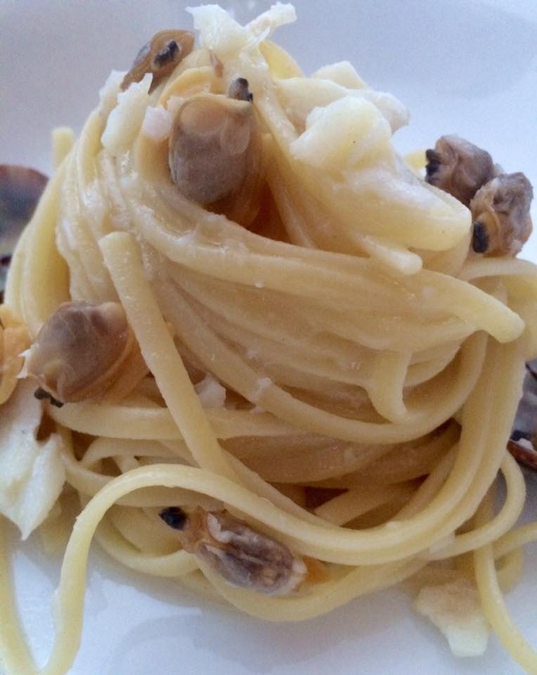 Qui proponiamo delle linguine alle vongole arricchite con un po’ di baccalà. Qualche goccia di limone aggiunta prima di mescolare et voilà: piatto di grande gusto e soddisfazione. Piccolo suggerimento: meglio non salare l’acqua della pasta.