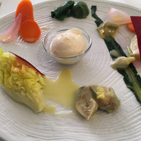 Una semplice insalata con il gelato di rafano i cui ingredienti vengono dalle Peracciole, la tenuta a Punta Campanella dove Alfonso ormai ama trascorrere il suo tempo. Nella quale il carciofo sa di carciofo, la carota di carota, etc etc. Cosa c’è di più prezioso e difficile da ottenere?