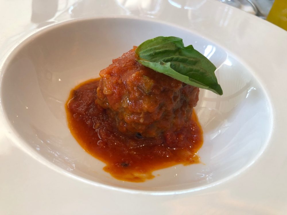 Lo Stuzzichino, polpetta di pesce azzurro su crema di zucchine dell’orto Ghezi