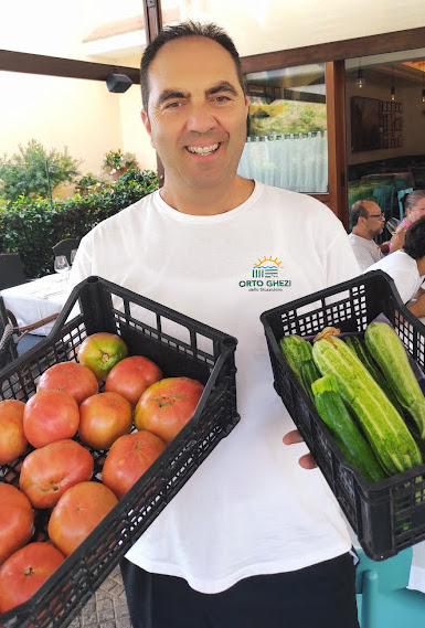 A pranzo e cena l’instancabile Mimmo, sempre col sorriso, guida i suoi ospiti nella scelta del menu e del vino negli spazi de “Lo Stuzzichino” (e nell’attigua sala degustazione riservata a piccoli e prestigiosi eventi) ma di mattina presto è l’Orto Ghezzi il suo regno. Pomodori, pomodorini rossi e gialli, zucchine, fiori di zucca e melanzane le verdure di questa stagione che poco dopo diventano protagoniste dei suoi piatti.