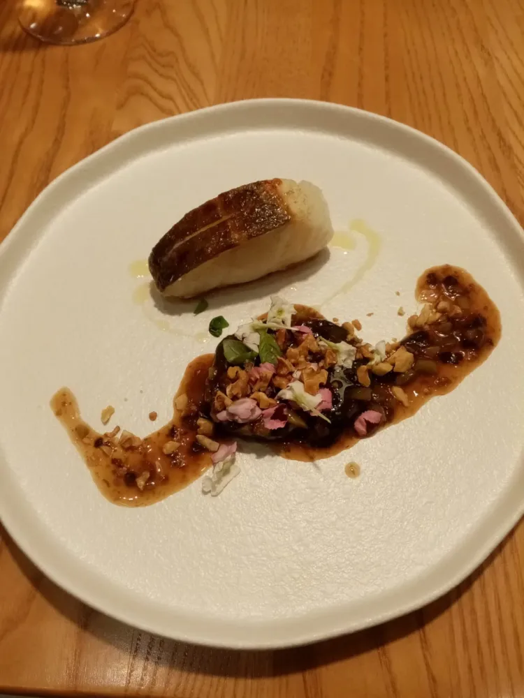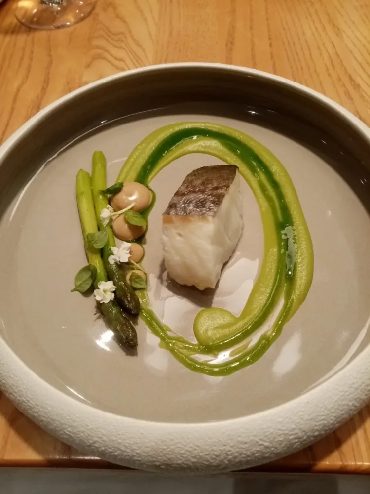 La locanda di Nonna Rosa – Baccalà cotto a bassa temperatura, crema di piselli, asparagi, maionese all’aglio nero fermentato