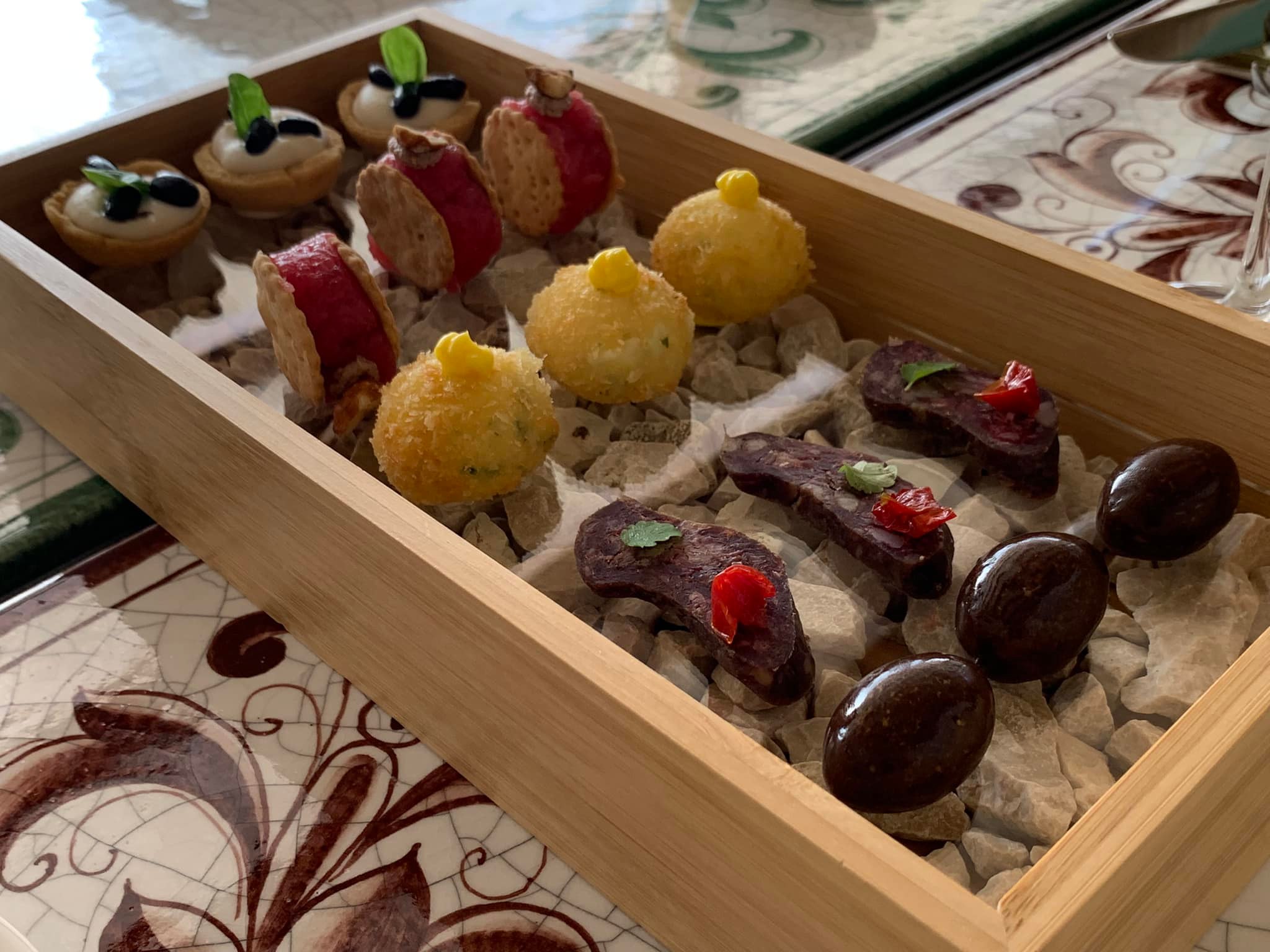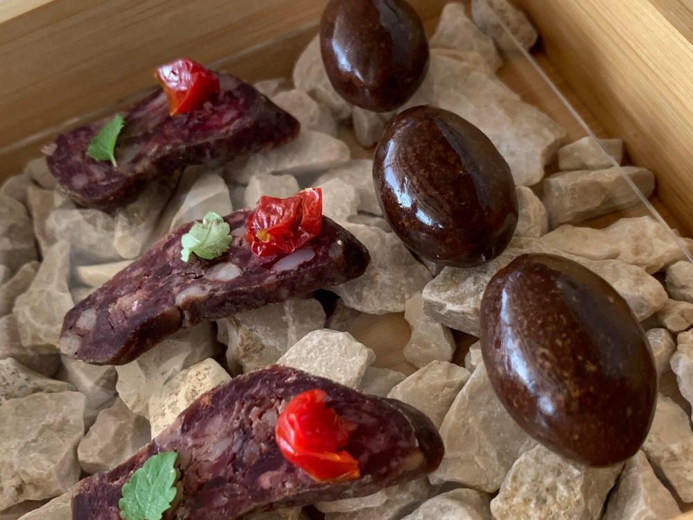Locanda Petreja, aperitivo, salame di fegato e olive ricostruite