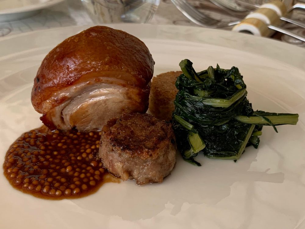 Locanda Petreja, il maiale orvietano con la sua cotenna con polenta di farro spezzato, cicoria, gelatina al limone, lavanda e peperoncino, salsa ai grani di senape