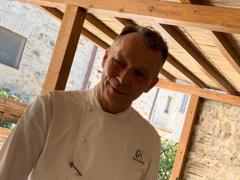 “Ogni giorno mi devo cambiare la giacca perché me la sporco” dice contento come un bambino Oliver Glowig che becchiamo a Todi nella Locanda Petreja di Borgo Petroro, un resort di lusso con piscina circondato dagli olivi da cui si produce olio e il grande orto che completa i piatti.