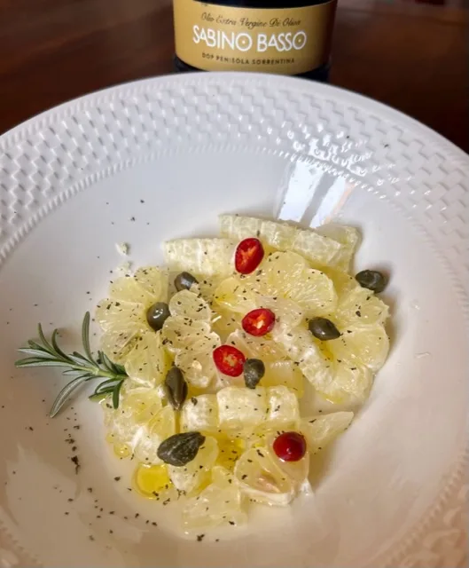 Dopo averlo degustato in purezza l’ho abbinato ad una insalata di limoni di Amalfi, con capperi di Pantelleria, menta e peperoncino fresco.