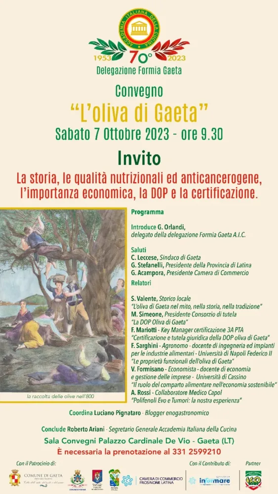 «L’Accademia Italiana della Cucina – ha spiegato il Presidente della Delegazione Formia Gaeta, Pino Orlandi -, fondata nel luglio del 1953, a Milano, da Orio Vergani e da un gruppo di esponenti della cultura, dell’industria e del giornalismo meneghino, dal 2003 Istituzione Culturale della Repubblica Italiana, ha lo scopo di tutelare le tradizioni della cucina italiana, di cui promuove e favorisce il miglioramento in Italia e all’estero, e attraverso il suo Centro Studi e le sue Delegazioni opera affinché siano promosse iniziative idonee a diffondere una migliore conoscenza dei valori tradizionali della cucina italiana. Per celebrare il settantesimo di fondazione, la Delegazione Formia Gaeta ha deciso di dedicare uno specifico convegno all’ingrediente che, prodotto in questa zona da sempre, è il più conosciuto nel mondo della gastronomia internazionale e abitualmente usato anche da tutti i più grandi chef: l’Oliva di Gaeta».