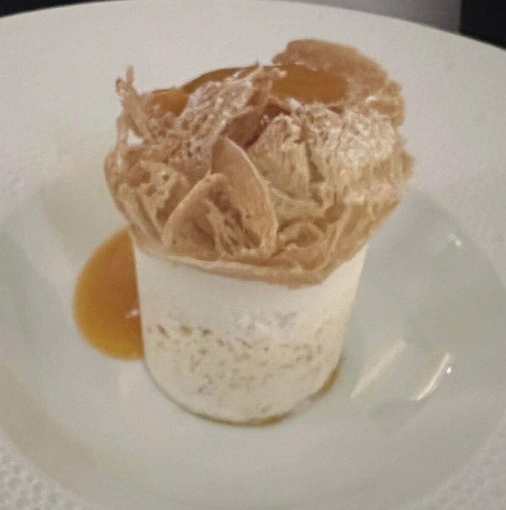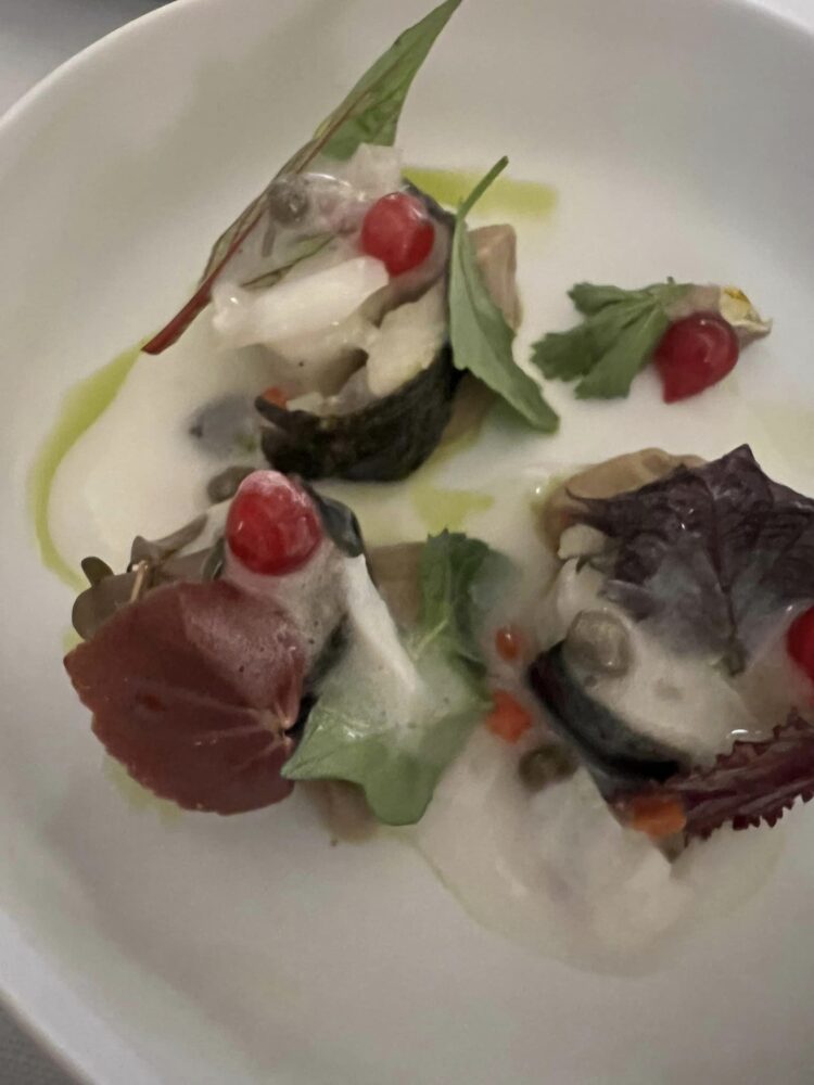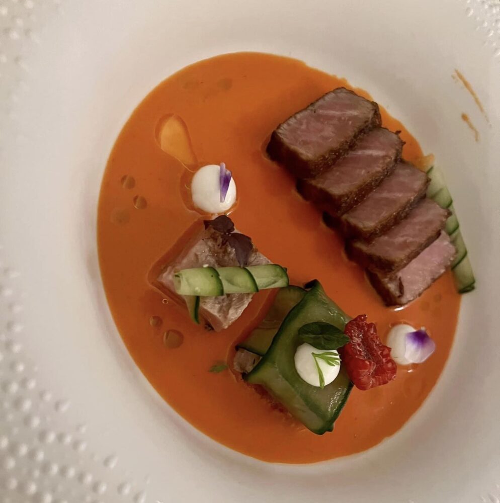 La ventresca di tonno con mandorle e ribes è un chiaro rimando alla modernità della cucina di Andrea, giocata in maniera semplice e intellegibile sui contrasti, sulla dolcezza e sul millimetrico dosaggio della sapidità.