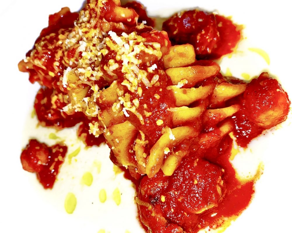Coraggio e forza di volontà, paradigmi della direzione illuminata targata Zanini e della cucina di Andrea Migliaccio. Coraggio nel riportare la tradizione partenopea in auge rendendola ancor più cool, la chiesa al centro del villaggio. Dunque Elica al Ragù Napoletano. Lenta cottura, 18 ore di passione, con polpettine e braciole in sezione. Nuovamente evoluzione, stavolta del celebre Risotto al Ragù Napoletano di Andrea che stavolta incontra la pasta secca, un tributo vero, un tributo d’amore a Napoli celebrato con estrema precisione al fine di restituire un sapore intenso e pieno, mai invasivo né sovrabbondante. Chiara espressione delle componenti primarie: “carne e pummarola”.