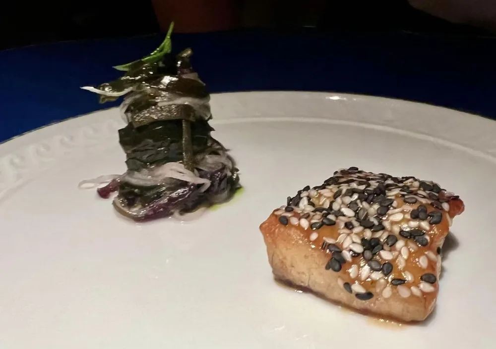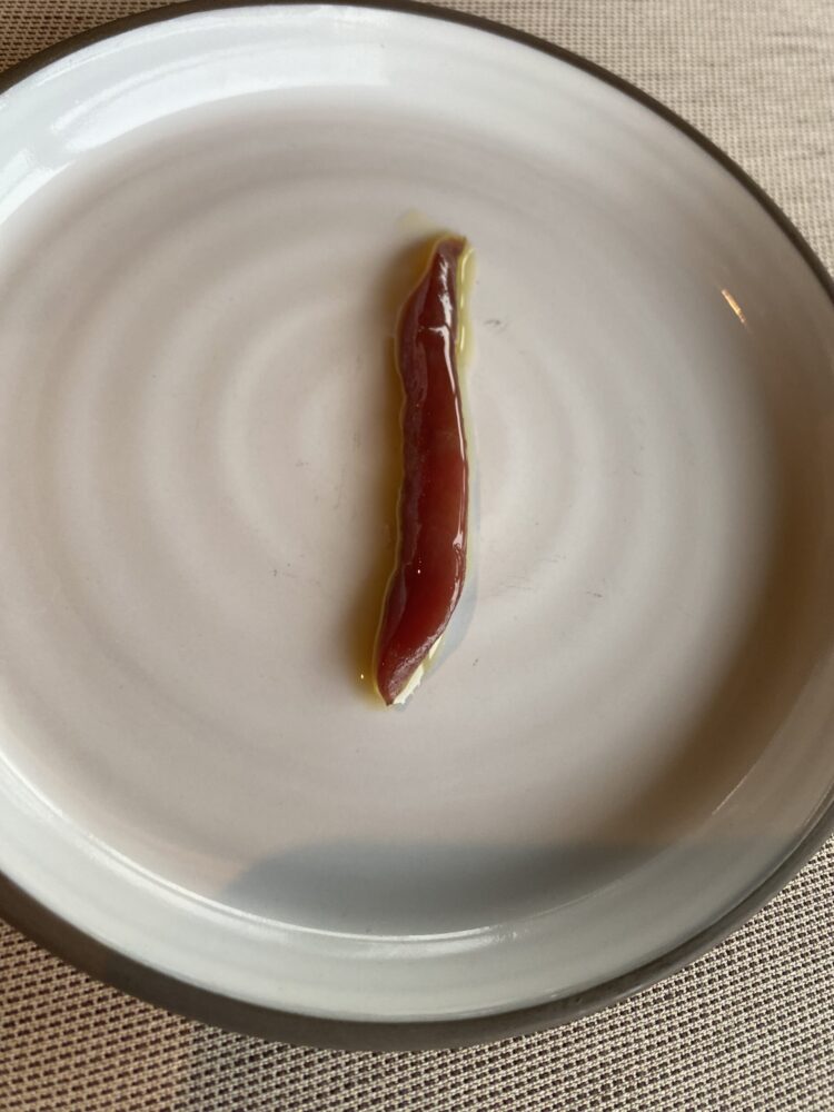 Questo invece è stato il piatto più deludente, il tonno. Già di per se la sua carne non è esaltante, assolutamente monotematica, qui penalizzata a mio parere da un eccesso di cottura che lo ha caramellato all’esterno. Dov’è il mare?