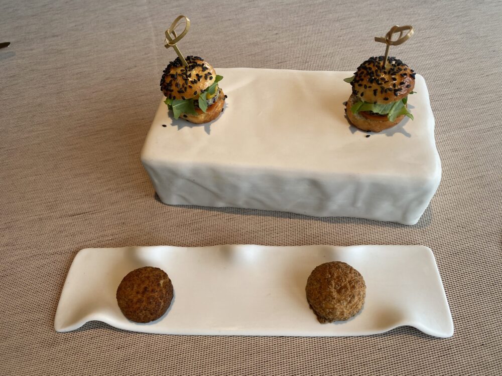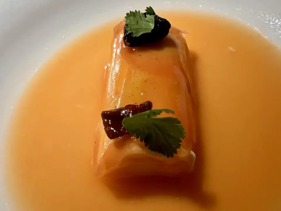 Le sfere di zucca esplodono in bocca spandendo dolcezza poi rinsavita da freschezza. Grande pensata ed effetto fuochi artificiali.