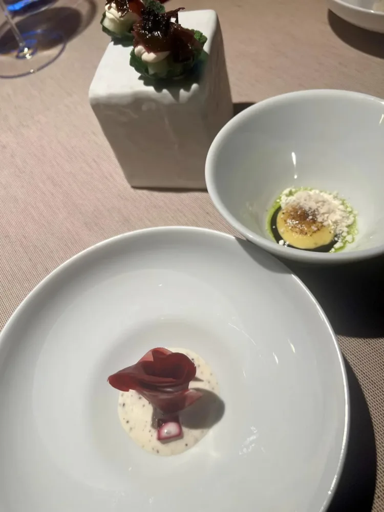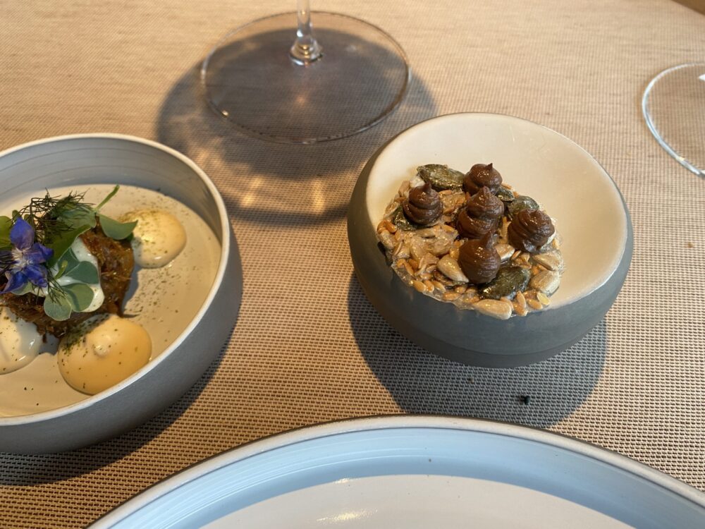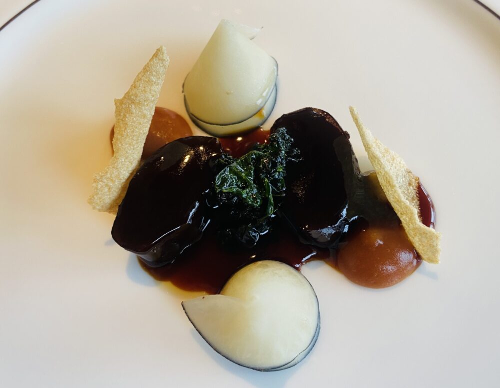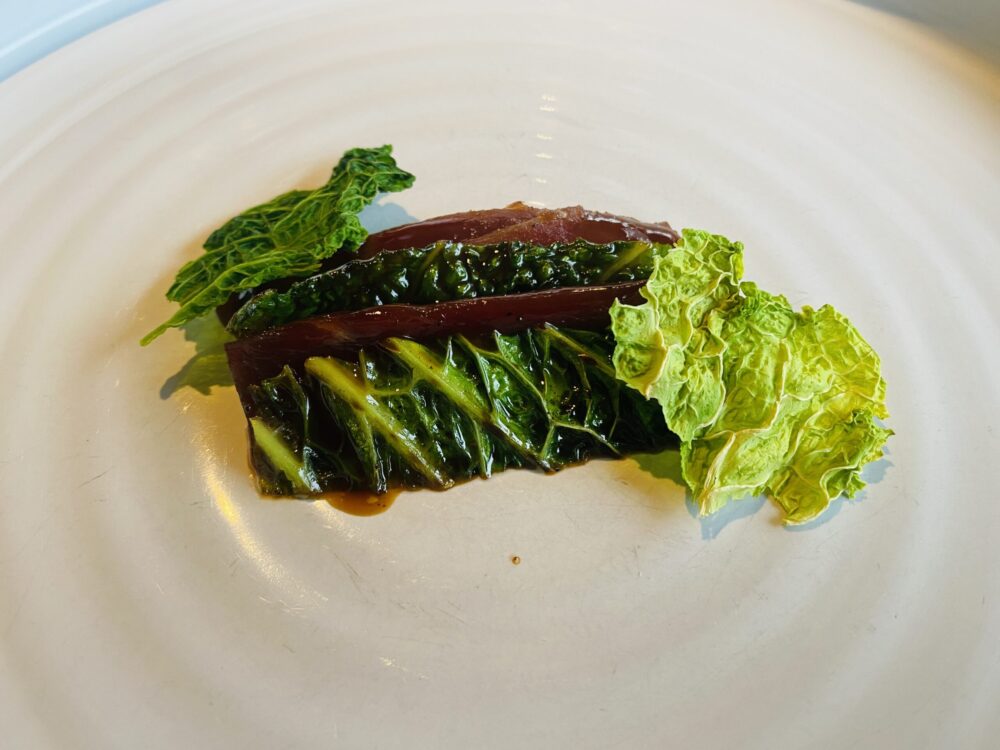 Tra i secondi questo è stato sicuramente il più divertente: fresco, molto dinamico, la dolcezza della carne d’oca è molto ben contrastata e si finisce rapidamente anche con l’aiuto delle erbe di campo.
