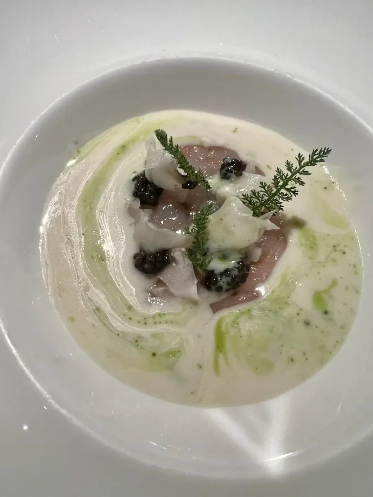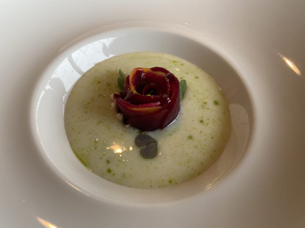 Il menu esclusivamente vegetale non è una concessione alla moda del momento, ma una naturale evoluzione di un percorso iniziato molti anni prima, ci dice Portinari. In ogni caso, nei mesi di gennaio e febbraio questo menu non sarà disponibile, presumibilmente sostituito da un intrigante percorso di selvaggina che non mancheremo per tutto l’oro del Mondo.